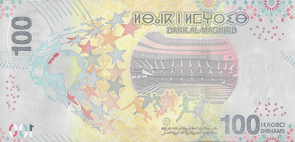 The banknote measures 144 × 70 mm, is printed on paper substrate, and produced by Dar As-Sikkah, Morocco’s state security printer. Its dominant palette—blue, orange, purple, yellow, and green—creates a vibrant and festive visual identity aligned with the spirit of sport, while maintaining the dignity expected of national currency.